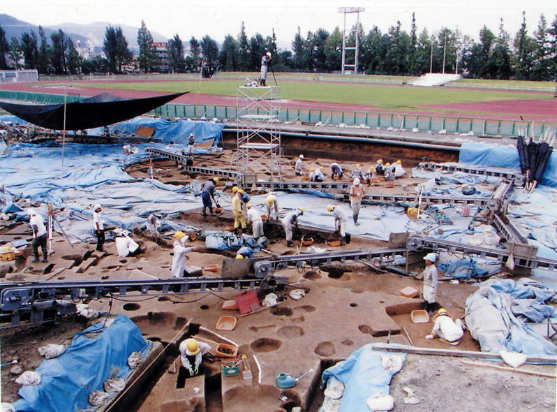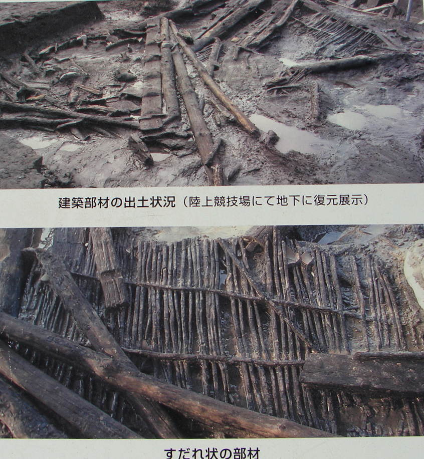 ![]() 陸上競技場の中を流れていた川から出土した部材 木材は、通常、朽ちてなくなってしまうので、これほどまとまって、しかも多くの種類の建築部材が発見されることは、極めてめずらしく、当時の建物の構造を考えるうえで、貴重な資料となっている。 |