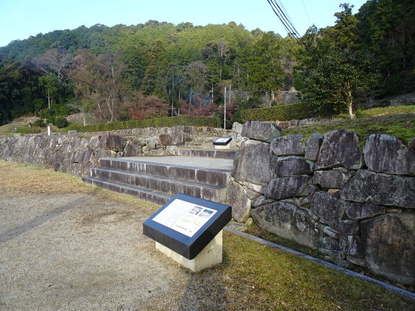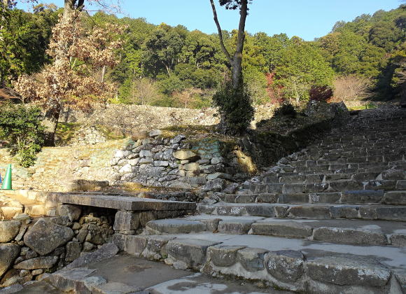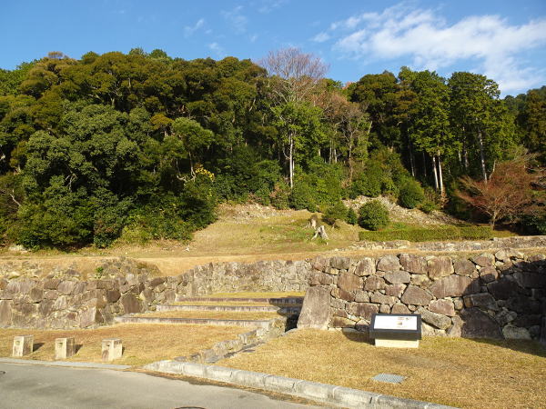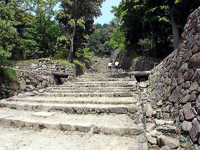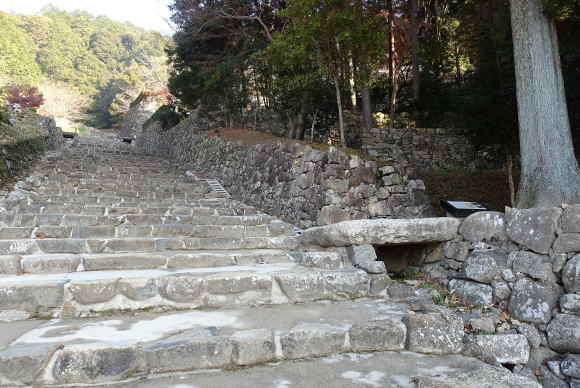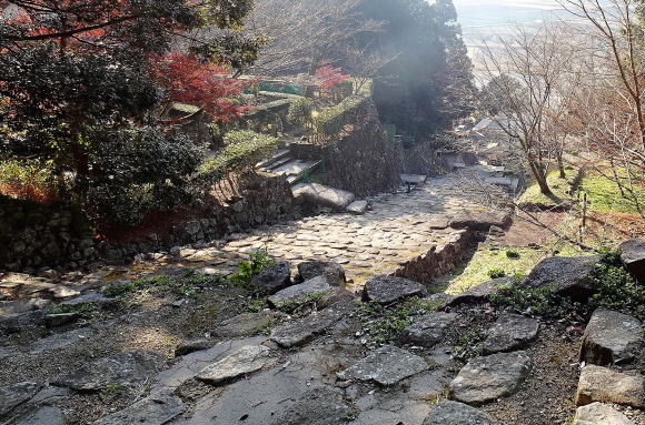 整備後の大手道![]() 発掘後の整備工事では、発掘調査で検出した石や同質の石材を用いて石段部分を復元。また、道の両側の石塁や溝も同様の方法で整備し、石垣も必要な部分のみ積み直しを行いました。こうして大手道は400年ぶりに築城当時の姿に蘇りました。 |