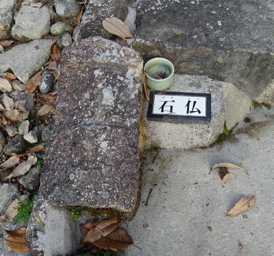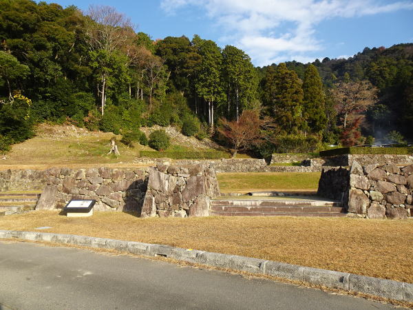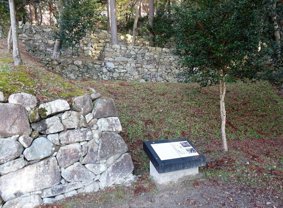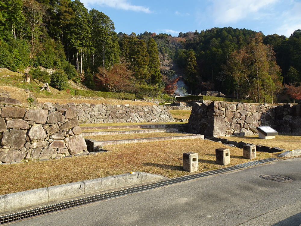 発掘前の大手道![]() 百々橋口道の途上にあったハ見寺は、 江戸時代末期の火災によって現在の地 に本堂を移転します。その際、大手道も 一部を埋め立てて石垣を築いたため、大 手道は石垣を大きく迂回する形となり道幅 も現在ほど広くはありません。 |