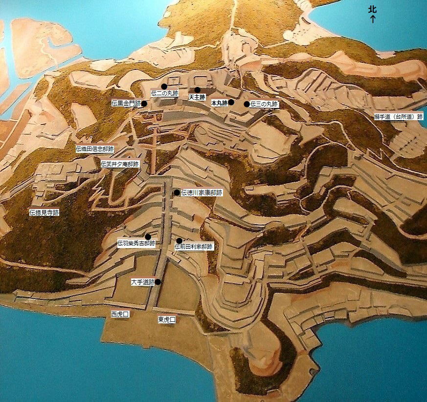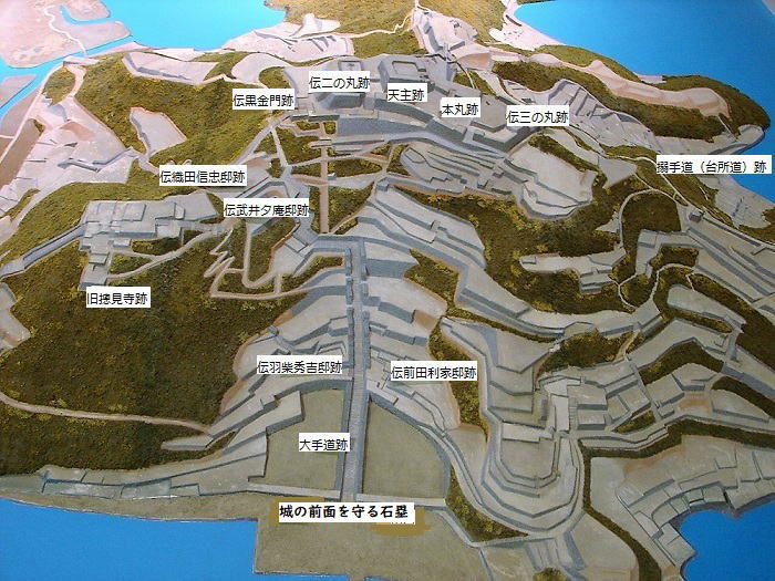 <安土城の前面(南山裾)を守る石垣・虎口が整備・復元>![]() 麓の発掘調査によって、大手道を挟んで東(右側)・西(左側)に石垣・虎口が造られていたことが判明。大手道の文字あたりが大手門跡と思われる。 ![]() (安土城跡地形模型。安土城考古博物館展示物に追記) |