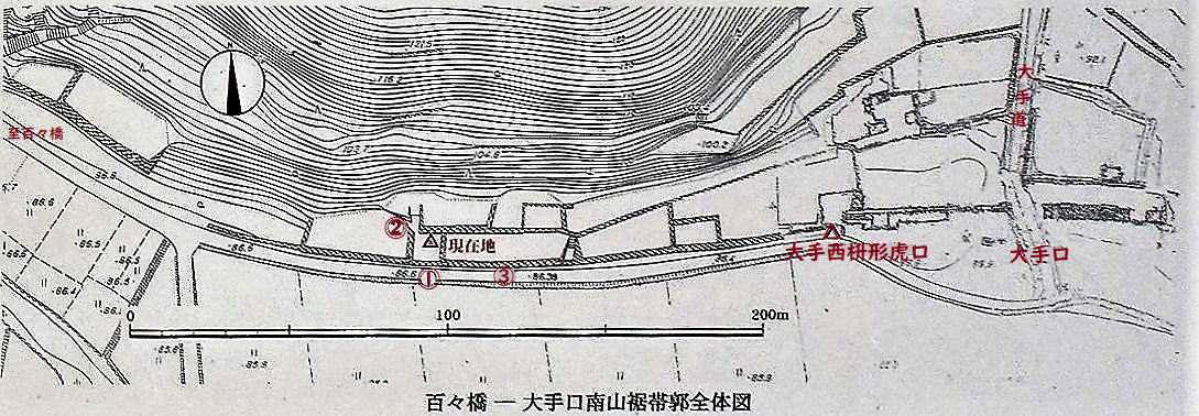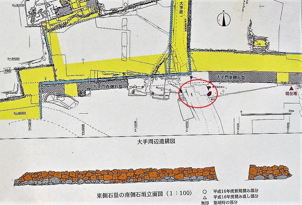 | 【枡形虎口・平入り虎口遺構平面図】 (上に掲載の「百々橋〜大手口南山裾帯郭全体図」の大手西枡形虎口拡大図) ![]() 大手門から西に延びる石塁には、枡形虎口と平入り虎口の2箇所の出入口がある。 (説明板に□を追記) |