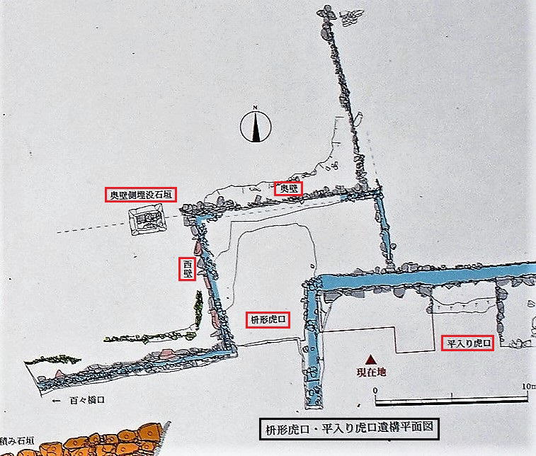 | 枡形虎口と奥壁 (「枡形虎口・平入り虎口遺構平面図」の枡形虎口と奥壁) ![]() 通路に面した枡形虎口を入った奥の石垣が奥壁 |