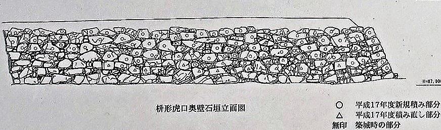 枡形虎口奥壁石垣立面図(説明板より)枡形虎口の西壁と南面石垣には約1.5m大の大石を等間隔に配置する模様積みですが、奥壁の石垣は約40〜60p大の石を布積みにしており石の積み方が違うことが分かりました。 さらに西壁の石垣は奥壁の石垣に当て付けており、奥壁の石垣は西に延びて埋め殺しになっていました。このことから、当初安土城の南面を画する奥壁の石垣が造られていましたが、天皇の行幸のため大手を三門にする設計変更をした際、南側に郭を継ぎ足して、石塁とセットになった枡形虎口が造られたと考えられます(文と図は説明板より)。 |