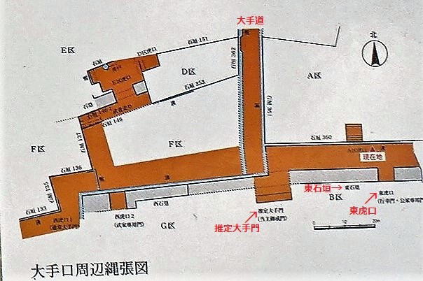 大手口南山裾帯郭全体図![]() (現地説明板に追記) 【大手口南山裾帯郭と石垣(復元)】 ![]() 上の全体図の@は西虎口、Aは石段、Bは東虎口周辺。通路に面して2箇所の虎口があり、手前の虎口はB東虎口となる。 東虎口は4段の石段を上がって入るなど西虎口(左下写真)と構造が異なるが、両虎口が取り付く下段郭に伴う一連の施設と考えられる。 |