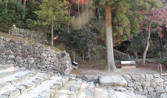 安土城を象徴する大手道 目の前にまっすぐ延びている幅広い道が、安土城の大手道です。安土城の正面玄関である大手門から山頂部に築かれた天主・本丸に至る城内では最も重要な道です。大手道は、その構造から、直線部分、横道・七曲がり状部分、主郭外周路部分の三つの部分によって構成されています。大手門から山腹まで、約180mにわたって直線的に延びる部分の道幅は、約6mと広く、その両側に幅1〜1.2mの石敷側溝があり、さらにその外側に高い石塁が築かれています。道の東西には、複数の郭を雛壇状に配した伝羽柴秀吉邸跡・伝前田利家邸跡等の屋敷があり、これらは書院造りの主殿を中心に厩や隅櫓等、多くの建物で構成されています。まさに、安土城の正面玄関を飾るにふさわしい堂々とした屋敷地と言えるでしょう。 山腹部分は、傾斜が最も急なところで、ジグザグに屈曲しながら延びています。この付近は、踏石や縁石に石仏が多く使われている他、屈曲部分に平坦な踊り場を造ることなく、踏石列を扇状に展開させていることが特徴です。 伝武井夕庵邸跡の北東付近から大手道は東へ屈曲し、主郭部の外周を構成している高石垣の裾を巡り、本丸に直接通じる本丸裏門に至ります。屈曲部分は幅4m程に狭まりますが、本丸裏門近くでは6mを超える広い道になります。安土城の正面を通る下街道から見える直線的な大手道とその延長上に聳える天主は、街道を行き交う人々に信長の力を強く印象付けたことでしょう(説明板より)。 ※大手道を歩いている人の左側が伝羽柴秀吉邸跡、右側が伝前田利家邸跡。大手道を上がって突き当たり手前の右側が伝徳川家康邸跡。 ![]() |