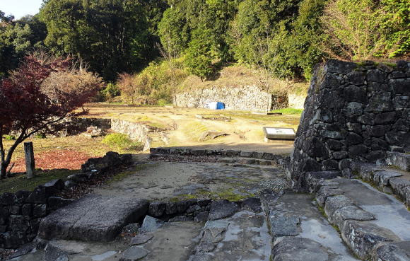 東側石塁北上段郭と虎口東側石塁東虎口の城内側は、一段高い郭(A区)が間近に迫り、この郭の南面を画する石垣(石垣360)により遮られています。 石塁との間は約6mあります。石垣に沿って側溝が設けられていることから大手道に通じる通路であったことが分かりました。 この石垣360には大手道から東へ約25mの地点に上段郭へ上がる虎口(A区虎口)が設けられていました。虎口は、間口約5.0m、奥行き約5.5m以上で、石段で上がるようになっています。石段は下段4段、上段3段で、中間に奥行き2.5mの踊り場が造られていました。踊り場には東西側壁寄りに門の袖柱を受ける礎石が残っていました。門の主柱を受ける礎石が残っていないため門の規模は不明ですが、残存する2基の小礎石から薬医門か唐門であったと思われます。 上段郭の内部は江戸時代以降に水田耕作などで開墾されており、築城時の遺構は残念ながら残っていません。しかし、虎口の門の形態や郭の広さから伝羽柴秀吉邸上段郭にあるような屋敷であったことが考えられます(文と図は説明板より)。 ※東側石塁北上段郭〜A区 虎口〜右図の現在地 |