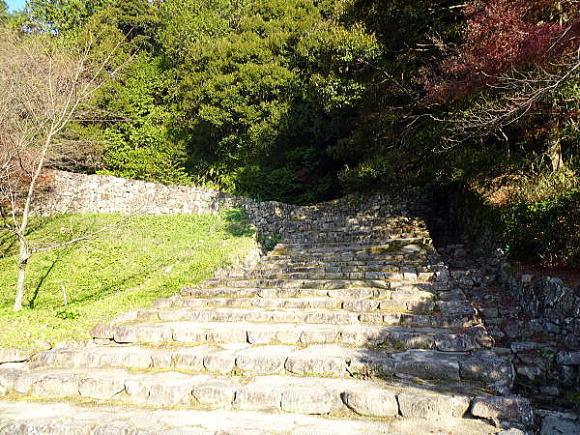 ![]() 全体図Aの石段 西虎口から上段郭に上がる石段。この石段の北側には用途・目的等が分からない石段と同じ勾配を持つ幅1.2mのスロープが付いている。 |