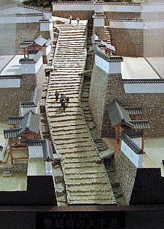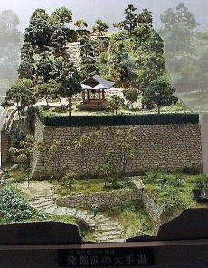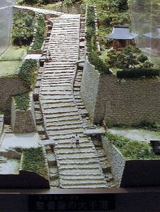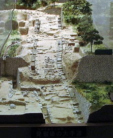 | ◆前のページに戻る ◆地域別訪問城に戻る ※大手道は大手口から主郭部へと通じる道で、安土城における山麓と城内を結ぶ道のひとつ。下の模型は、平成元年(1989)からほぼ10年におよぶ発掘調査で明らかとなった 築城当時から現在に至るまでの大手道の変遷を表したものです(大手道模型は安土城考古博物館展示品)。 |