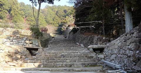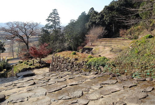 【遺構】天主台、曲輪、石垣、虎口、屋敷跡など ![]() (左)天主跡の礎石群。奥の虎口は、天主地階部分に1か所のみ設けらた出入口。 (右)大手道と伝羽柴秀吉邸跡 |