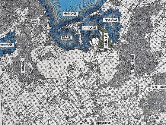 【明治26年の安土城周辺地形図(説明板より)】![]() まだこの当時の安土山の三方は琵琶湖の内湖が山麓までせまっている。西の湖 は現在も残っている。 |