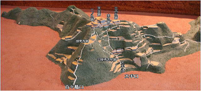 | 【城地種類】山城。標高199m、地上からは約110m。安土城は琵琶湖東岸に築かれた。 (写真左)安土城考古博物館から見た安土城跡 (写真右)安土城周辺模型(安土城考古博物館展示) 現在では、安土山の北と東西の三方の山麓は、干拓事業の結果、田園地帯 となっているが、築城当時の安土山は、三方の山麓まで琵琶湖の内湖が迫り 半島状の地形をしていた。南側(大手門側)は内堀でかためていた。 ![]() |