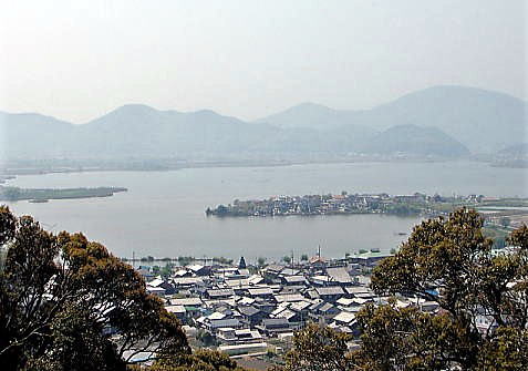 ![]() 安土城・ハ見寺本堂跡から琵琶湖の内湖である西之湖を望む。 |