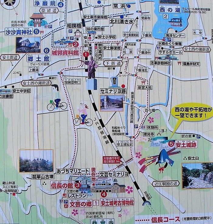 【安土城周辺図】![]() 訪問時(2021年12月再訪問)は、JR安土駅前のレンタサイクルを利用して約10分でした。 |