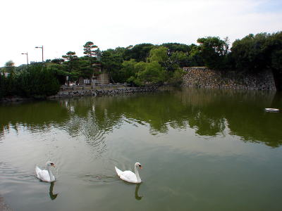 | ■現 況 | 明石城跡を中心に兵庫県立明石公園として整備 <明石城正面入口>中堀に架かる土橋を渡ったところは、かつて三の丸・居屋敷曲輪への虎口である太鼓門があった場所。 今でも中堀には、満々と水が湛えられている。 |