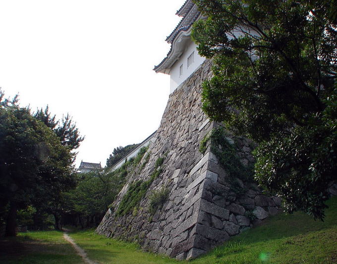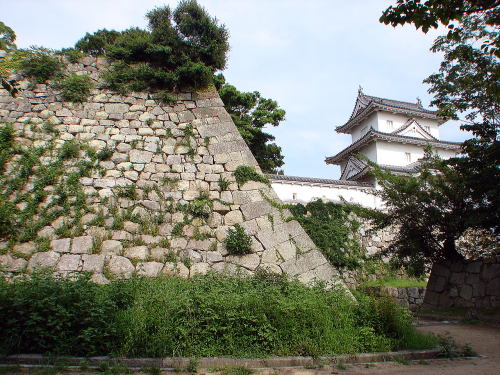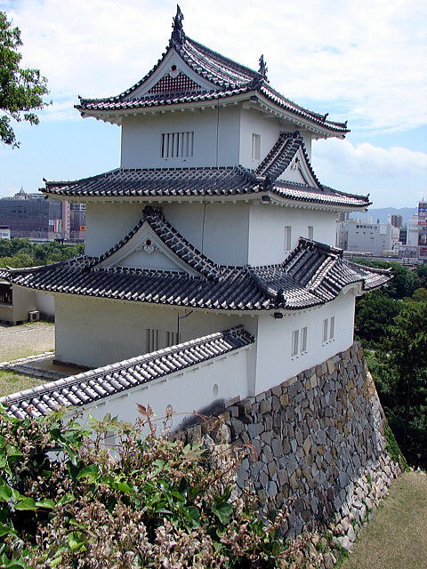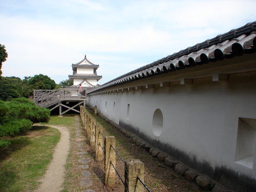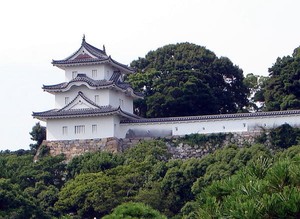 ![]() 高石垣上に建つ重要文化財の坤櫓(左端・ひつじさるやぐら)と巽櫓(右端・たつみやぐら)。両櫓(三重櫓)を結ぶ白壁の長塀は復元 |