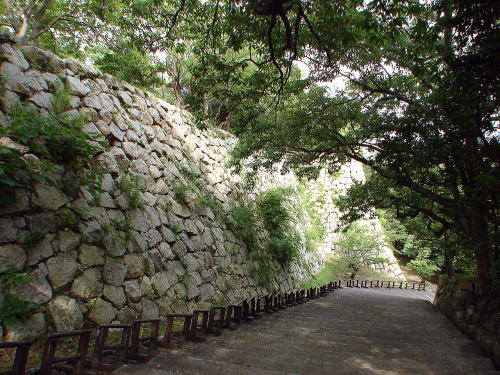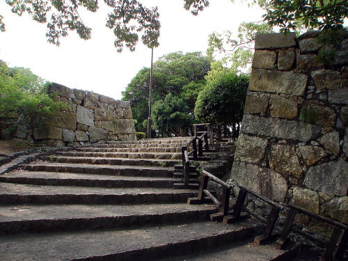 ![]() 二の丸石垣 石段下の「三の丸」跡(現・武蔵の庭園)から「二の丸」跡へ通じる石段。 石段を上がった所が右写真。 |