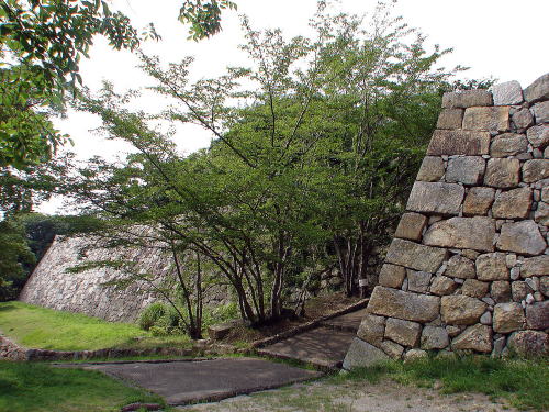 ![]() 稲荷曲輪石垣(左奥) 本丸より一段低く「稲荷曲輪」跡がある。本丸石垣(右側)と稲荷曲輪石垣の間の石段を登った所に天守台が位置する。 |
