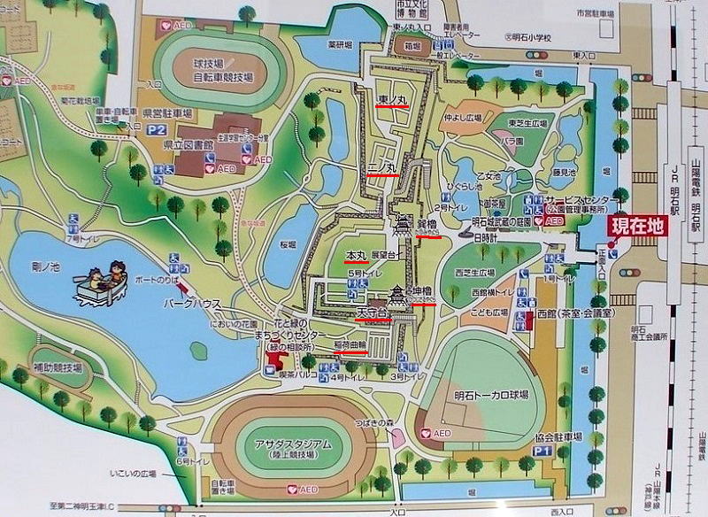 | ■城 図 | ![]() 東から西へ、東の丸・二の丸・本丸・本丸より一段低く稲荷曲輪を一直線に並べた連郭式の縄張。 上記城図、現在地の堀が中堀。 この中心部の遺構は比較的よく残るが、本丸の北に桜堀を隔てたところに置かれた北の丸(現在は球技場・図書館)、本丸の南に配された三の丸(現在は武蔵の庭園)、居屋敷曲輪(現在は野球場)、本丸の西側の山里曲輪(現在は陸上競技場)は破壊され、外郭や外堀はJR明石駅や山陽電鉄明石駅その他市街地となっている(城図は現地案内板に加筆) |