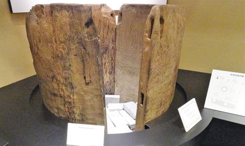 ![]() 加工した杉材を円形に組合わせて造られた井筒 井戸の底には杉の厚い板6枚が円形に組まれた「井筒」が埋め込まれていました。 (秋田城跡歴史資料館展示品) |