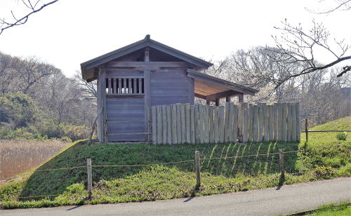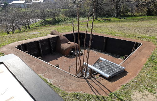![]() 竪穴式住居跡(復元) 秋田城跡では、奈良・平安時代の竪穴式住居跡が300軒以上発見されていますが、これはもっとも古い竪穴式住居跡の1棟です。ここでは地表から下の部分を、焼失住居跡等をてがかりに復元し表示しています。 |