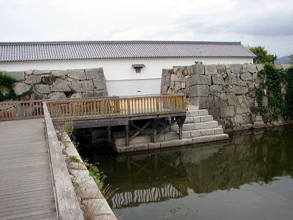![]() 水手門(みずのてもん) かつて赤穂城は、東に熊見川(現在の千種川)、南はヨシ原が広がる干潟に面しており、満潮時には海水が石垣まで迫っていた。水手門には、物資を運んできた船を泊めるための「船着場の雁木」や船を波から守る「突堤(波止場)」など、海城の特徴を伝える貴重な施設が、発掘調査などに基づき復元されている。 |