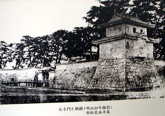 古写真で見る三之丸大手門と隅櫓(明治初年に撮影)大手門の高麗門と隅櫓の間、土塀の後方に櫓門が見える。ここは桝形門であった。写真は城内説明板より転載。 |