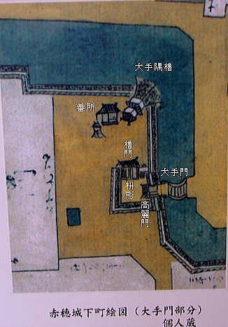 大手門桝形赤穂城の表虎口である三之丸大手門は、石垣を方形に積上げた桝形と高麗門、櫓門の二重の城門を備えた最も厳重な桝形門であった。桝形は打ち出す兵を待機させたり、敵兵を閉じ込めて攻撃するためのもので、その規模は長辺10間(約19.8m.)、短辺6間(約11.8m)、面積234uである。現在ある高麗門は、隅櫓、土塀とともに昭和30年(1955)に再建されたものである。 桝形石垣は、明治19年(1886)にその形状を大きく改変され、その後周辺は赤穂大石神社の境内となっていたが、文化庁の国庫補助事業によって公有化が図られ、平成15年(2003)に石垣の修復及び周辺整備が完成した。 発掘調査によって、桝形石垣、櫓門跡、番所跡、上水道施設、排水枡、大石内蔵助屋敷土塀石垣など多くの遺構が見つかっている。櫓門は、幅4間半(約8.9m)、奥行2間(約4m)であったことが明らかとなり、新たに板石を埋め込んで礎石の位置を示している。 |