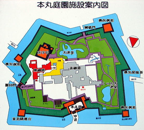 ![]() 本丸内部には天守台・御殿及び番所・倉庫等の付属建物・池泉等があった。本丸の表玄関となる本丸門は、一の門である櫓門と二の門である高麗門及び桝形から構成される。本丸門は廃城後取り壊されたが、平成4〜8年(1992〜96)にかけて復元された。 藩邸である御殿は大きく表・中奥・奥に分けられる。表御殿は藩庁としての公的施設、中奥は藩主の私的な部屋、奥御殿は奥方・女中達の施設であった。この御殿の南東に天守台、南には大池泉があり、大池泉は昭和59年(1984)の発掘調査によって全容が明らかにされ、復元整備されている。 隅櫓台4箇所のうち、東北隅櫓台のみに二重櫓が築かれ、ほかは横矢桝形として配されていた。本丸へ入る門は、本丸門、厩口門(森時代には台所門)、刎橋門(裏口非常門)の3門からなる。 |
