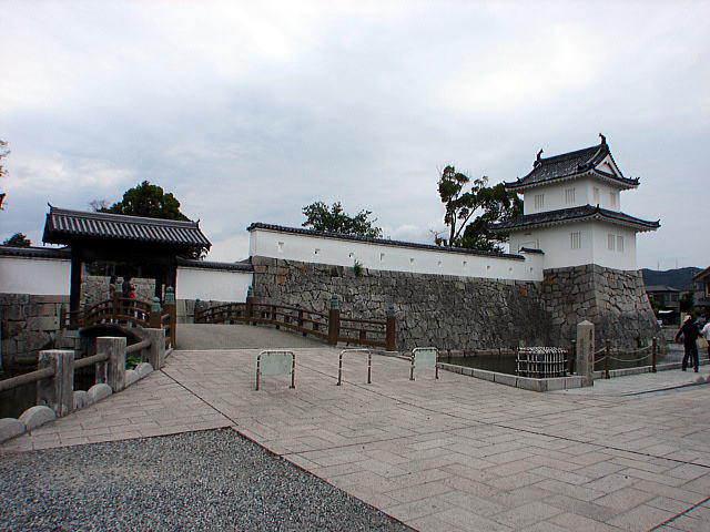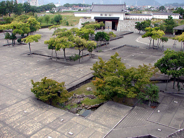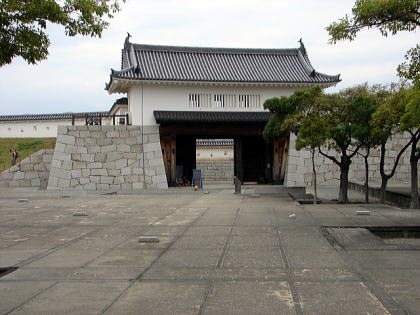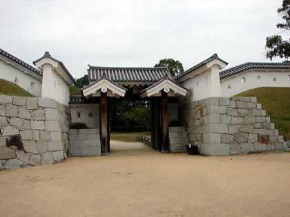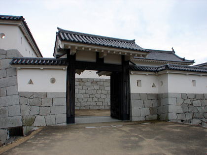 平成14年までに本丸庭園、本丸門、ニノ丸米蔵、大手門枡形を復元・整備。 ![]() 復元された本丸門 |
