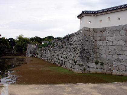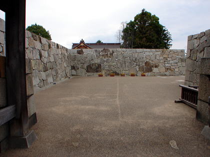![]() 本丸石垣 本丸門手前の中道から見た打込みハギ石垣。左端は東北隅櫓台。 |