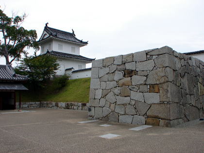 ![]() 櫓門跡から見た三之丸大手隅櫓 左の平屋建物は番所跡に建てられた休憩所。当時、番所には門番として足軽3名、下番2名が詰め、大手門の警護にあたっていた。 |