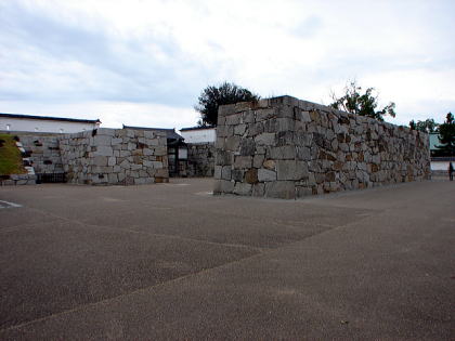![]() 三之丸大手門の高麗門を入った所の桝形石垣 突き当たりの石垣右側が櫓門跡。 |