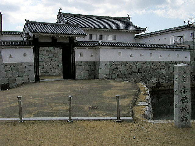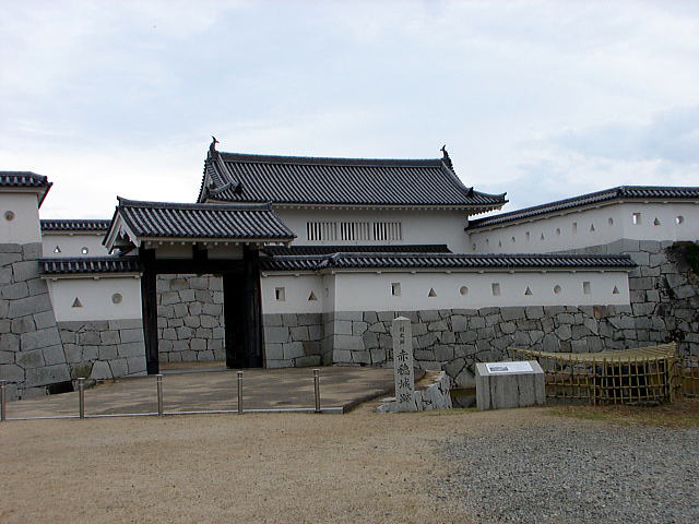 ![]() 本丸門 復元された本丸門は、平成4年文化庁の地域中核史跡等整備特別事業として、全国で初めて採択され、国・兵庫県の補助を受けて平成8年3月に完成。木材には欅・桧・杉など国産(内地)材を使用し、石材に赤穂産花崗岩を用いた伝統工法で仕上げている。一の門(脇戸付櫓門)は木造本瓦葺入母屋造り、幅13m、高さ11m、二の門(小戸付高麗門)は木造本瓦葺切妻造り、幅4m、高さ6mである。 |