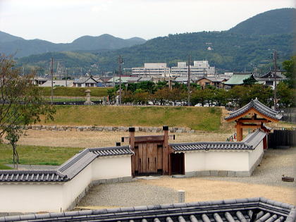 ![]() 本丸櫓門から見た大石頼母屋敷跡 屋敷跡は平成10〜11年(1998〜1999)に発掘調査が実施され、土塀基礎石垣や建物礎石などの遺構が検出された。 |
