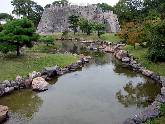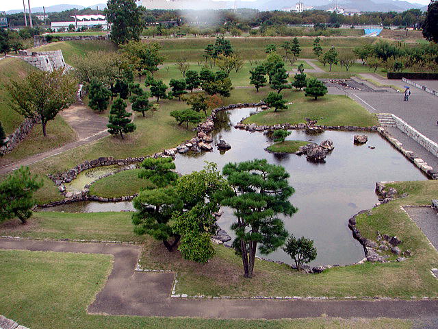 本丸庭園と天守台本丸庭園の大池泉越しに見た天守台。庭園は地中に埋没していたが発掘調査によって発見された。現在は修復整備がなされ、往時の庭園風景が再現されている。 |