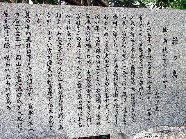 今見る藤戸・天城の山丘はかっては藤戸海峡に浮ぶ島であった。その後、次第に開発されかつて海の姿は消え、僅かに南北に流れる倉敷川が藤戸海峡のなごりをとどめているのみである。この橋の上流一帯が「平家物語」や謡曲「藤戸」で知られている、源氏の武将「佐々木盛綱」が渡海先陣で功名を挙げた、源平藤戸合戦の古戦場で多くの伝説・史跡を今に伝える。