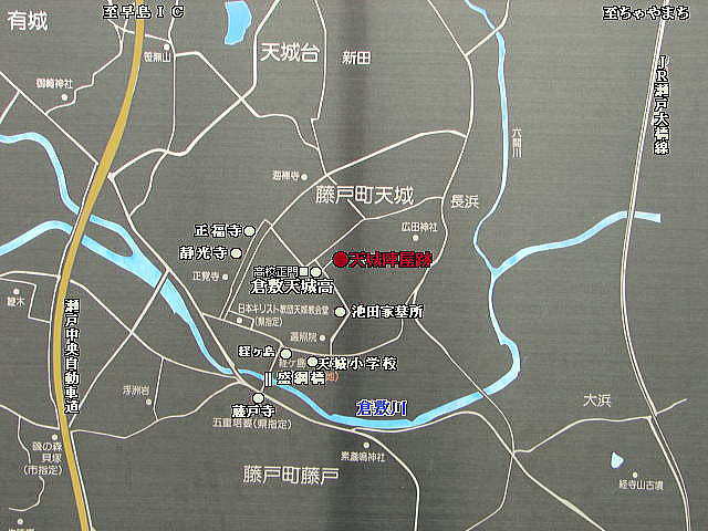 天城陣屋跡は、倉敷天城高校正門前を左折し、高校敷地に沿って右に曲がると数10m先の左手に高校サブグランドへの登り口があり、そこを登った所に陣屋跡の石碑が建っています。天城陣屋門が移築現存されている静光寺の程近くにある正福寺には、下津井城の城門が移築され残っています。