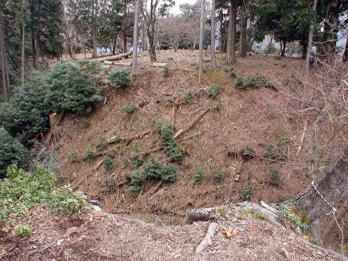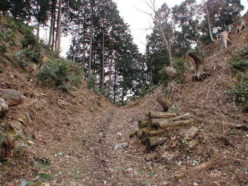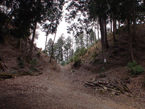 ![]() 本丸と千畳敷の間の尾根を断ち切っている大堀切 南西側から見た大堀切。大堀切を挟んで左が主郭跡、右側が千畳敷跡。樹木等が伐採されて見学しやすくなっている。 |