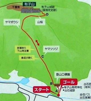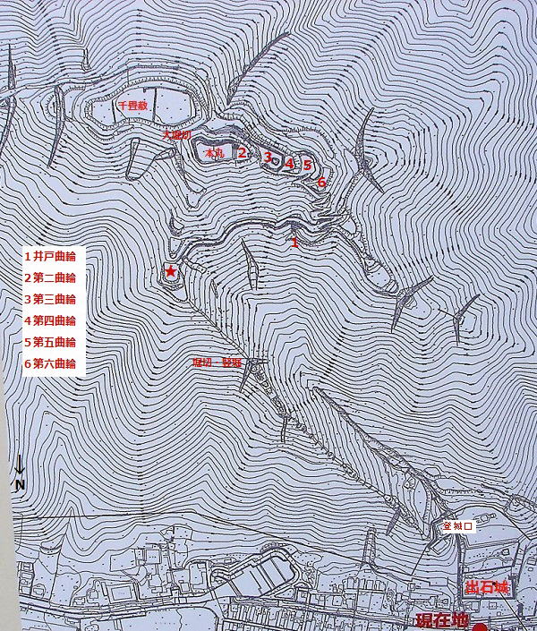 【城史】この城は天正2年(1574)、山名祐豊(やまなすけとよ)がそれまで本城であった此隅山(このすみやま)城にかわって築城しました。その名は落城した「子盗(このすみ)」(此隅)の名前を嫌って「有子」と命名したといわれます。しかし、わずか6年後の天正8年(1580)、天下統一をねらう織田軍によって城は陥落、城主は因幡(いなば)へと逃亡し山名氏による但馬(たじま)支配は終わります。その後、織田系の大名が城主となりますが、江戸時代にはふもとに出石城が築かれ廃城となりました。 【現状】 標高321mの有子山山頂に主郭があり、その西側には5段の曲輪が階段状に築かれています。また、主郭の南東には千畳敷と呼ばれる広い曲輪があります。石垣は織田系の大名により作られたもので、中世城郭が近世城郭に移行するまでの過渡期の形態をよく残しています。 【山名氏】 山名氏は室町幕府において侍所の長官に任じられた、有力な大名の一人です。最盛期には全国66か国のうち11国を守護として領国支配をしていたことから「六分の一衆(ろくぶんのいちしゅう)」と呼ばれ、後の応仁の乱では西軍の総大将として参戦しました。但馬では、南北朝時代から戦国時代までの約200年間、一貫して山名氏が守護の地位にありました。この山名氏の最後の本城が有子山城です。 ▼山頂の有子山城と麓の出石城 ![]() ※縄張図の★は中間地点(500m)となり、登城口から★まではほぼ真っ直ぐな厳しい急坂が続きますが、ここより右折れしてなだらかな道となり、ここまで登れば一安心です。訪城日=2018年3月。 (有子山城縄張図と文は現地説明板より。縄張図には一部追記) |