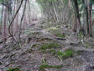 ![]() 竪堀 中間地点に行くまでの登城道途中に土橋があり、その両横には竪堀が残る。 |