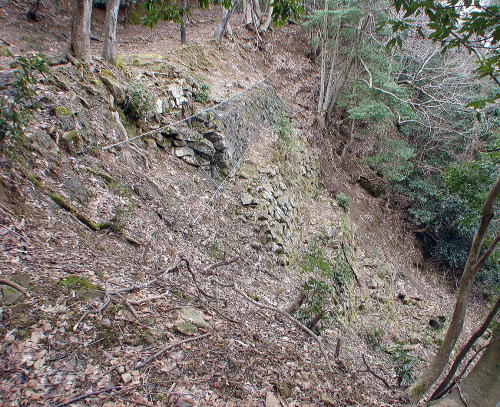 ![]() 第六曲輪の石垣 井戸曲輪から登って行くと最初に出会う石垣です。 |