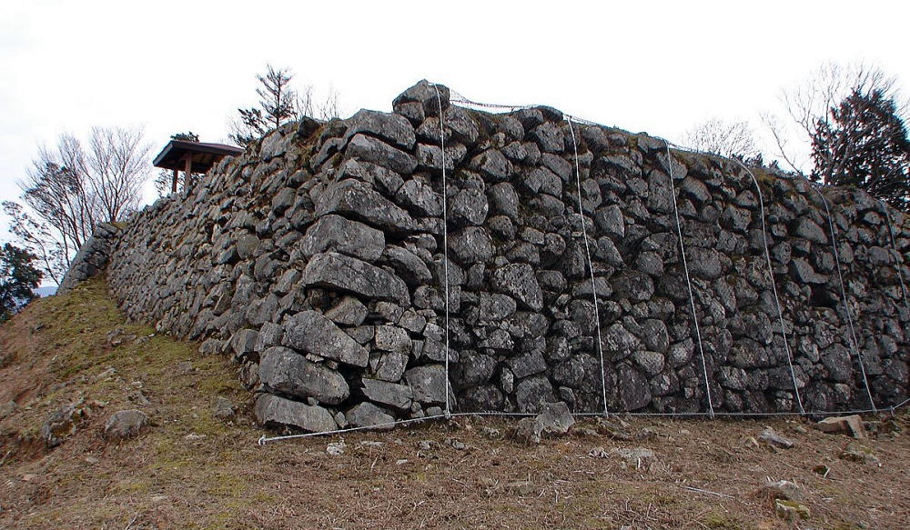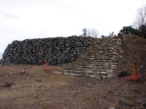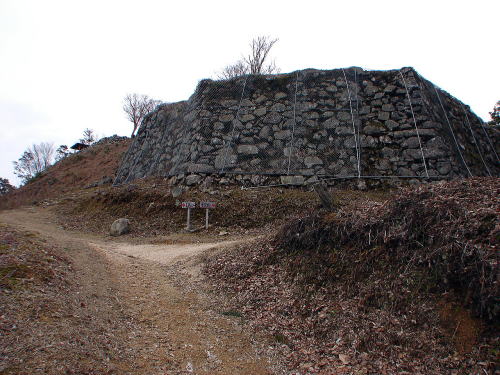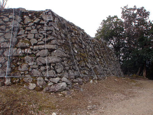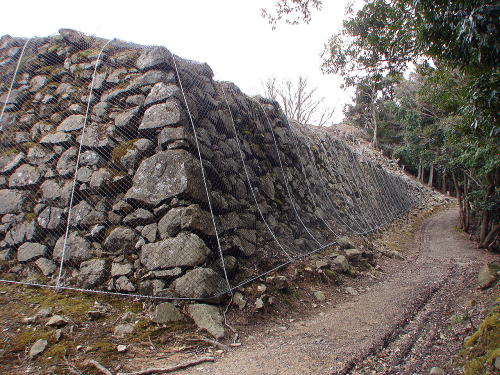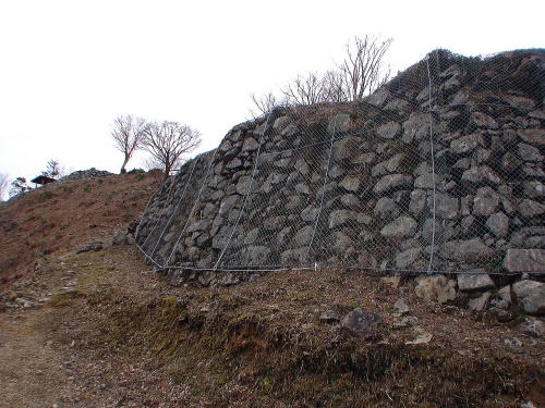 ![]() 第三曲輪の石垣(南辺) 石垣右側の道を奥へ進むと千畳敷に至る。石垣の状態を見ると、往時の石垣なので、場所によっては、「孕(はら)み出し」の症状が起きており、その為に金網ネットで防護しているのでしょうか。 ※年代の経過とともに次第に石垣がゆがんで崩れそうになることがある。石垣の中央より下方部が外側へ丸く迫り出し、上方部は後ろへ下がる「孕み出し」という症状。 |