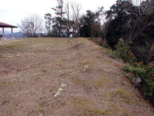 ![]() 第三曲輪石垣(北辺) 左側を登って第二曲輪から本丸をめざす。本丸は、左上の東屋が建つ石垣部分。 |