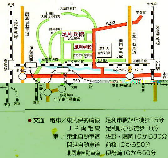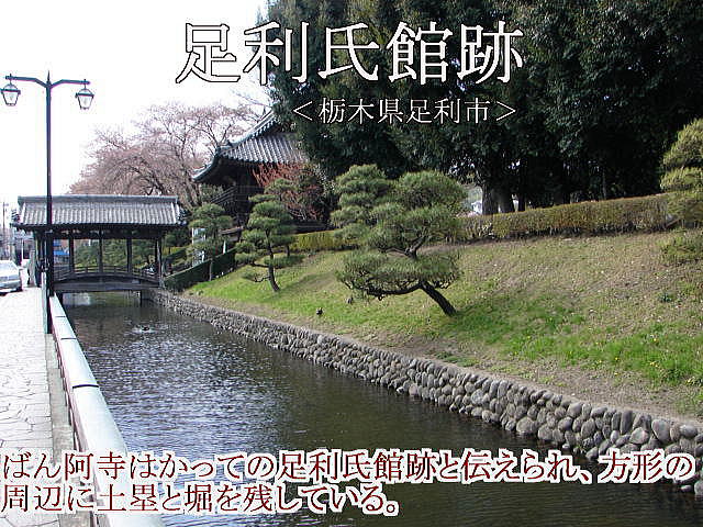 ◆二町四方の台形館で、四面をめぐる水堀と土塁がよく残っている。館跡は、鎌倉時代の地方武士の館の姿を今に伝える貴重な遺構。館内には、ばんな寺が建てられ、足利氏の氏寺として一族の崇敬を集めた。また、館の南方には「坂東の大学」と称せられた足利学校があり、全国から俊才が集まった。