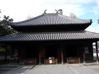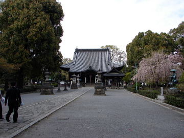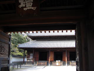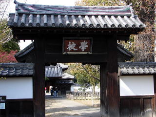 (右)裏門 学生や一般の人の通用門として使用されていた門。平成二(一九九〇)年に復原。後方に見えるのは方丈・庫裡。