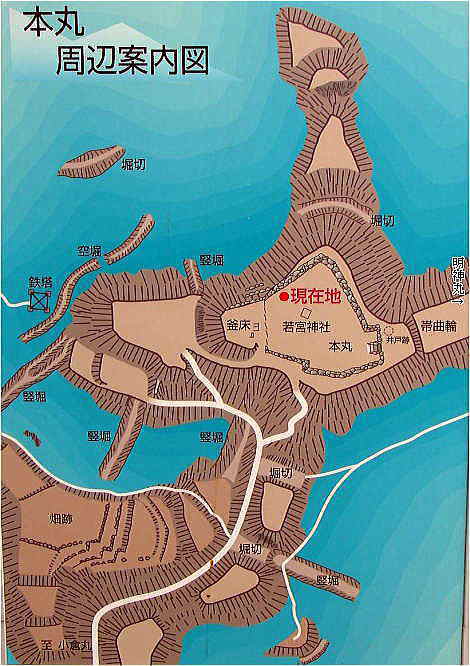 ![]() (上)帯曲輪と後方奥は本丸跡 帯曲輪は、曲輪の側面や城の周りを帯状に細長く囲む曲輪。この帯曲輪は本丸と明神丸を結び、城を守るための大切な曲輪となっていた。 (下)本丸跡図(城内説明板より) ![]() |