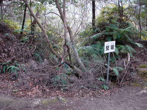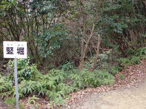 ![]() 堀切 この堀切は上の明神丸から続く尾根を鉈(なた)で切ったように山を切り崩して作られています。堀切によって才蔵丸は孤立した曲輪となっています。 |