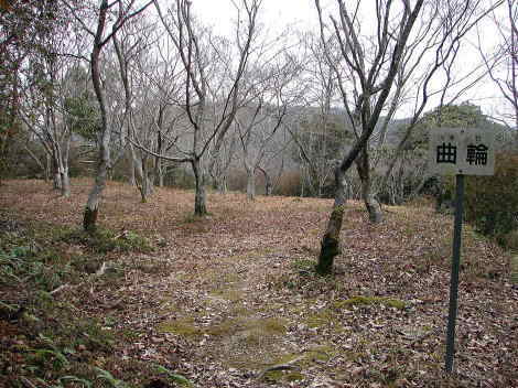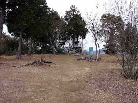 ![]() 本丸跡 後方下は、城の炊事場であった釜床跡。 |