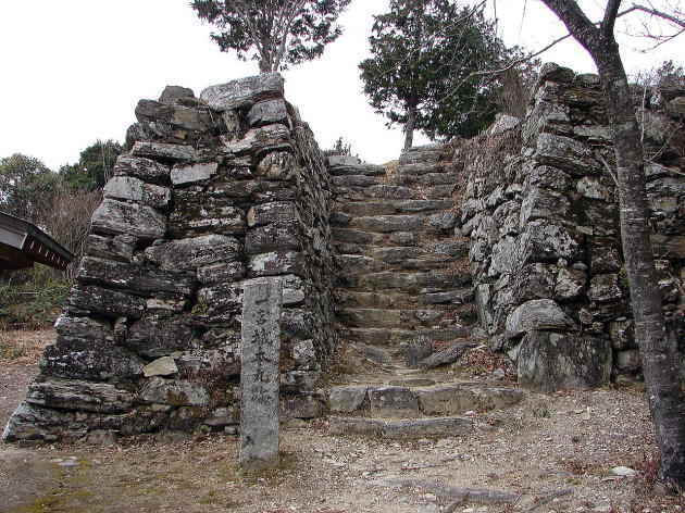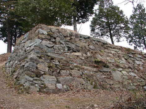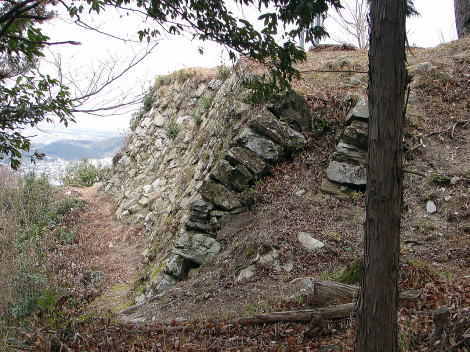 本丸に残る石垣現在では、標高144メートルの本丸跡に石塁が残る。 その他、竪堀・空堀や明神丸、才蔵丸、水手丸、小倉丸、椎丸、倉庫跡の遺構も明らかで、貯水池といわれるくぼ地もその跡をとどめている。 |