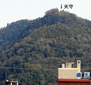 ■備中高梁駅から天守を望む。駅から車で約10分でふいご峠着。但し、土・日・祝日はふもとの「城見橋公園」から「ふいご峠」までシャトルバスの利用となります。